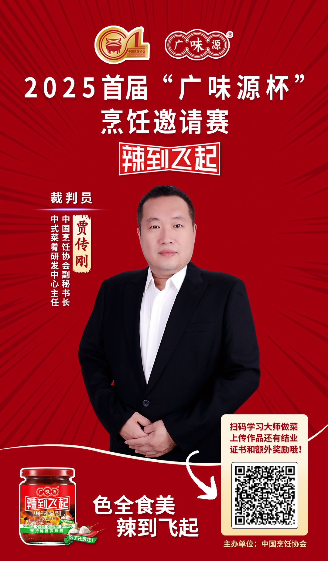 大賽特設(shè)總監(jiān)審長,由中國烹飪協(xié)會協(xié)會副秘書長兼研發(fā)中心主任賈傳剛先生親自擔(dān)綱!作為行業(yè)規(guī)范與發(fā)展的引領(lǐng)者,賈監(jiān)審長將以國家級專業(yè)視角與絕對公信力,全程督導(dǎo)評審流程,為賽事的最高水準(zhǔn)與公平透明構(gòu)筑堅實(shí)后盾,確保“廣味源杯”成為業(yè)界標(biāo)桿。