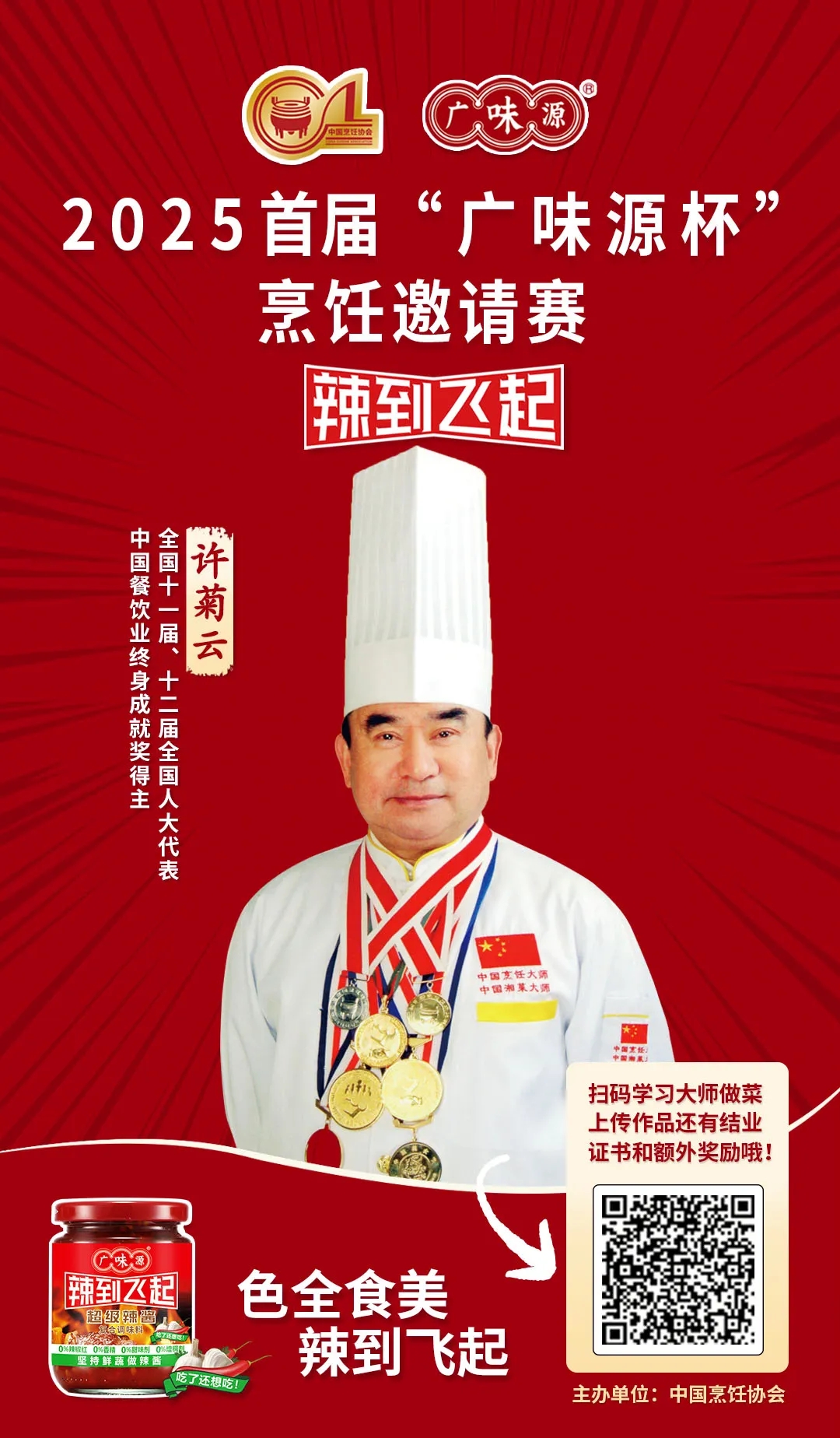 更令人屏息以待的是,一位承載無數(shù)榮耀與敬仰的神秘宗師將親臨現(xiàn)場!他,正是湘菜傳奇、全國十一屆、十二屆全國人大代表、中國餐飲業(yè)終身成就獎得主許菊云大師!許老的到來,不僅是對新生代廚藝力量的莫大鼓舞,更是對“廣味源杯”弘揚(yáng)中華飲食文化使命的至高認(rèn)可。他的目光所及,必將點(diǎn)亮賽場最耀眼的星火!